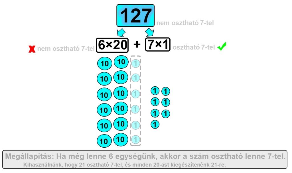 A korábban már látott ábra azt szemlélteti, hogyha a 127-hez hozzáadnánk 6-ot, akkor 7-tel osztható számot kapnánk. Itt a hiány tehát 6 volt.