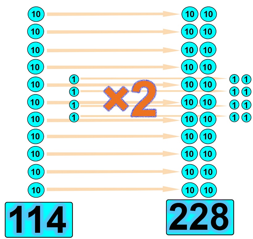 Alábbi ábra szemlélteti, mi is történik pontosan, amikor egy számot megkétszerezünk (11 db 10-esünk van a 114-ben, melyet nem tudnánk párosítani):