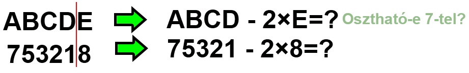 - Belátható, hogy eredeti számunk kétszerese akkor és csakis akkor osztható 7-tel, amennyiben a (-hiány)+maradék=? egyenlet megoldása osztható 7-tel.