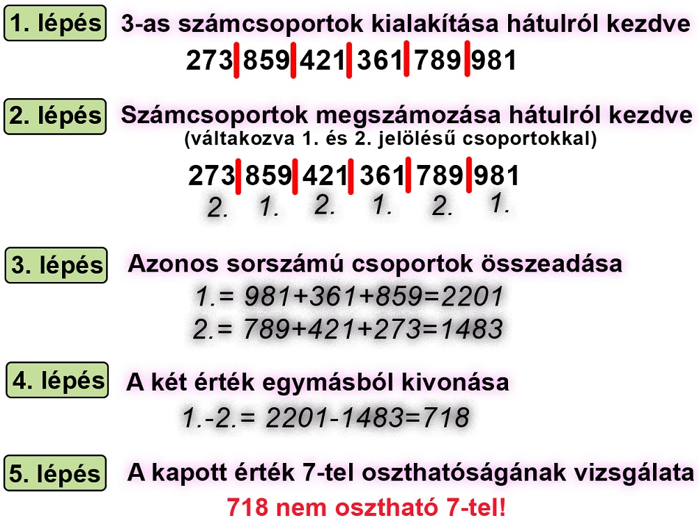 Tehát a hiányok és maradékok kioltják egymást, a számhármasok előjeles összege 0 lesz, vagyis a számunk osztható 7-tel. - 517.483