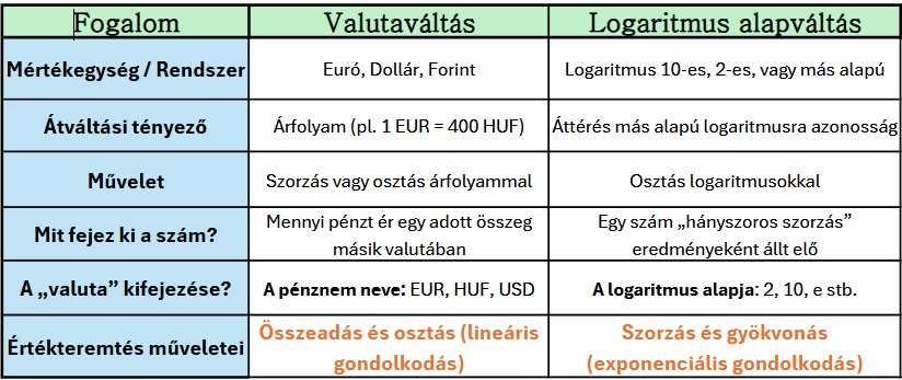 Zárásként pedig egy összehasonlító táblázat a logaritmus és a valuták közti párhuzamok felderítésére: