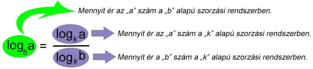 Amikor áttérünk más alapú logaritmusra, akkor valójában ugyanezt csináljuk, a mögöttes gondolatmenet ugyanez. Van egy számom (előző analógiában ez volt a 800 forint), van egy alapom (előző analógiában ezt volt a cseh korona, valuta), s kíváncsi vagyok, hogy az a szám mennyit ér az alap rendszerében ( előző analógiában 800 forint cseh koronában). Viszont csak azt tudom, hogy egy másik rendszerhez viszonyítva mennyit ér maga a szám és az alap, de ez bőven elég ( a példában a forint és a korona az euróhoz viszonyítva). Az “áttérés más alapú logaritmusra” azonosság a következőképpen írható fel: