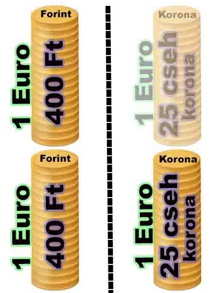 Fenti képletbe behelyettesítéssel kapjuk, hogy 1 korona 400/25 azaz 16 forintot ér (természetesen kizárólag 400 forint/euró és 25 cseh korona/euró árfolyammal számolva).
