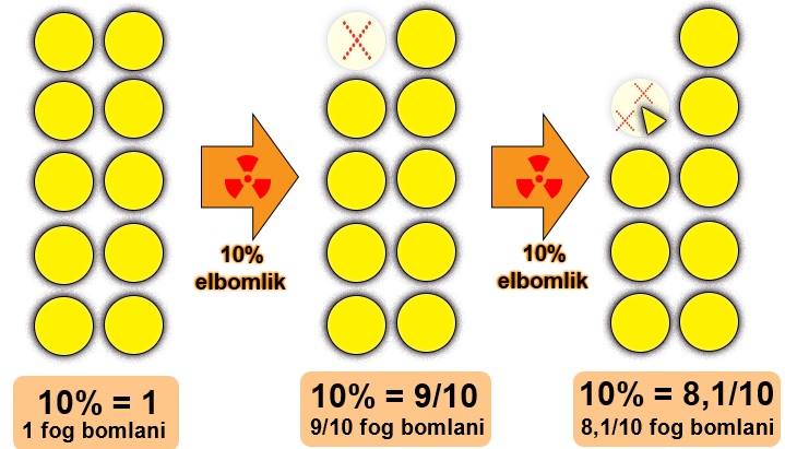 – Valójában a rendelkezésre álló anyagmennyiség folyamatosan változik, ezért a fenti ábra sem mutatja be pontosan a folyamatot. Nem arról van szó, hogy az anyag „megvárja”, míg elbomlik 10%-a, majd újraszámolja magát, és ismét 10% bomlik el. A változás nem írható le ilyen szakaszosan.