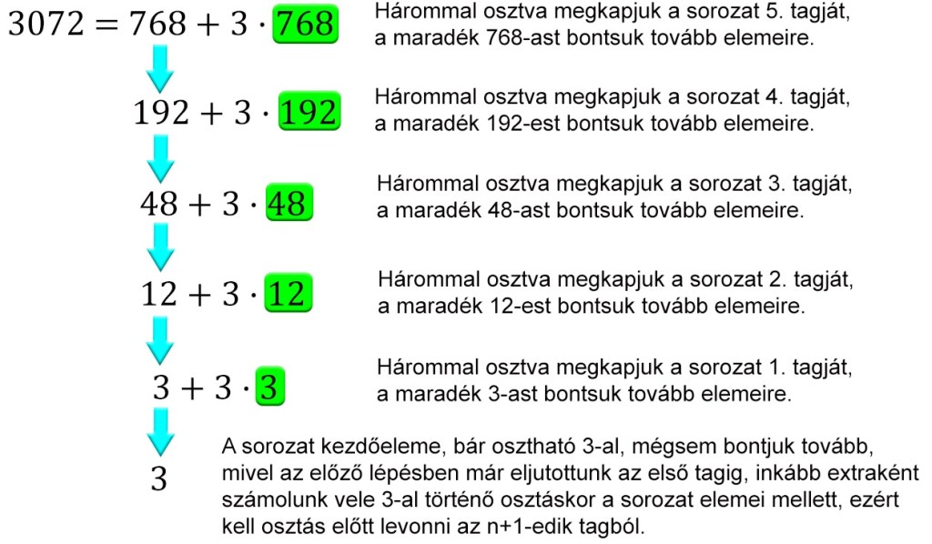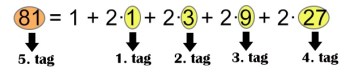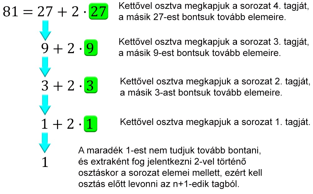 Kezdjük azzal, hogy ebben a sorozatban hogyan kaptuk meg a 81-et? A sorozat előző tagjának háromszorosa, vagyis 81=3·27. Azonban felírható máshogy is. 81= 27 + 2·27. Ezután a 27-et bontsuk tovább, ami nem más mint 27= 9 + 2·9. És ezt a felbontási folyamatot másoljuk egészen addig, amíg el nem jutnk a sorozat első tagjáig. Az alábbi ábra szemlélteti a folyamatot: