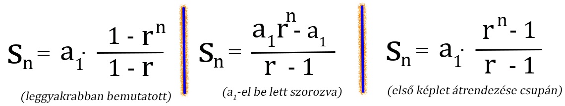 A mértani sorozat első n tagjának összegét leíró képletnek több változata is van attól függően, hogy lett rendezve a képlet, ezenfelül a szorzótényezőt rövidíthetik “r” helyett “q”-val is, de mindegyik képlet ekvivalens. Az itt felsorolásra került képletek közül a 3.-at vizsgáltuk a formula működésének megértéséhez az előző fejezetben.